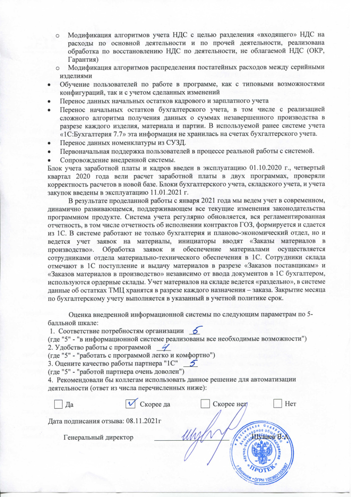 В результате проделанной работы с января 2021 года клиент ведет учет в современном, динамично развивающемся, поддерживающем все текущие изменения законодательства программном продукте. Система учета регулярно обновляется, вся регламентированная отчетность, в том числе отчетность об исполнении контрактов ГОЗ, формируется и сдается из 1С. В системе работают не только бухгалтерия и планово-экономический отдел, но и ведется учет заявок на материалы, инициаторы вводят «Заказы материалов в производство». Обработка заявок и обеспечение материалами осуществляется сотрудниками отдела материально-технического обеспечения в 1С. Сотрудники склада отмечают в 1С поступление и выдачу материалов в разрезе «Заказов поставщикам» и «Заказов материалов в производство» независимо от ввода документов в 1С бухгалтером, используются ордерные склады. Учет материалов на складе ведется «раздельно», в системе данные об остатках ТМЦ хранятся в разрезе каждого назначения – заказа. Закрытие месяца по бухгалтерскому учету выполняется в указанный в учетной политике срок.