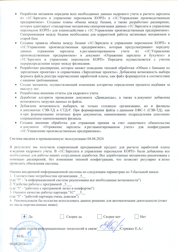 В результате заказчик получил современный программный продукт для расчета заработной платы и ведения кадрового учета. В 1С:ЗУП КОРП 3.1 были добавлены все необходимые для работы сотрудников заказчика доработки. Все доработанные механизмы реализованы с помощью расширений, без изменения типовой конфигурации, что позволит регулярно и легко проводить обновления системы.