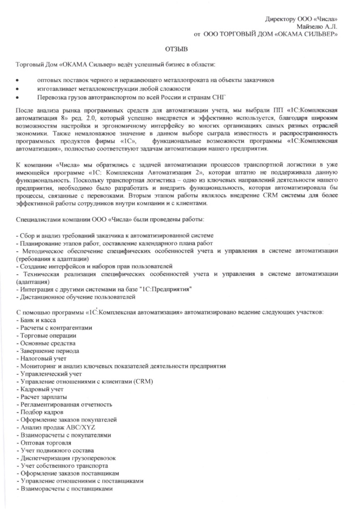 Изначально клиент обратился к нам с задачей автоматизации процессов транспортной логистики в уже имеющейся программе «1С: Комплексная Автоматизация 2», которая штатно не поддерживала данную функциональность. Поскольку транспортная логистика – одно из ключевых направлений деятельности «ОКАМА Сильвер», необходимо было разработать и внедрить функциональность, которая автоматизировала бы процессы, связанные с перевозками. Вторым этапом работы являлось внедрение CRM системы для более эффективной работы сотрудников внутри компании и с клиентами.