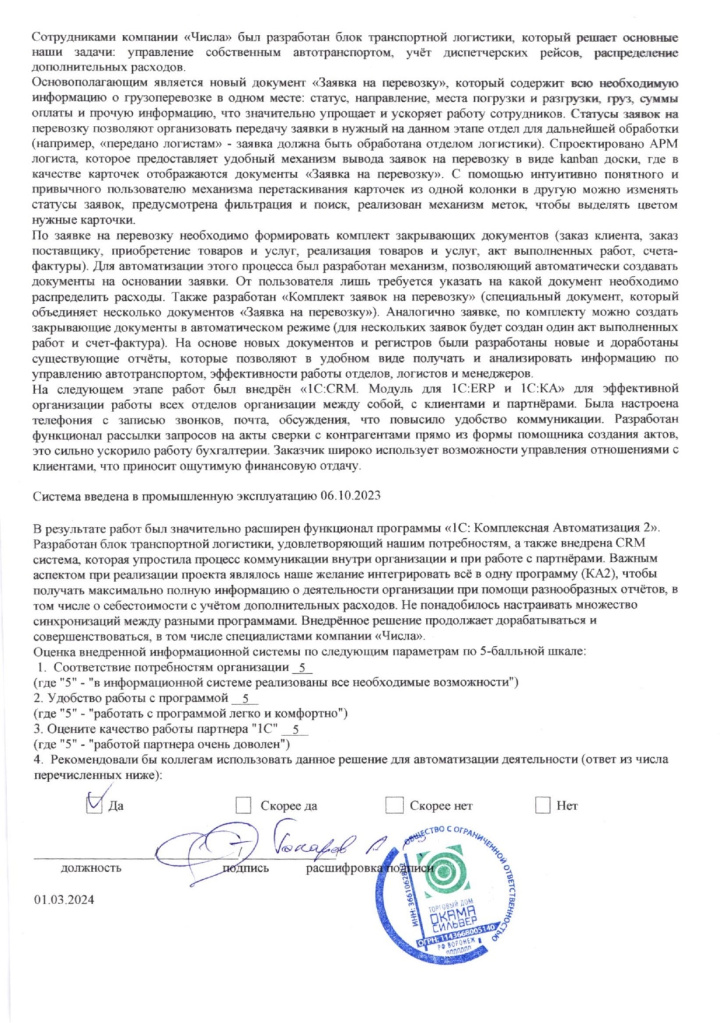 В результате работы был значительно расширен функционал программы «1С: Комплексная Автоматизация 2». Разработан блок транспортной логистики, удовлетворяющий потребности клиента, а также внедрена CRM система, которая упростила процесс коммуникации внутри организации и при работе с партнёрами. Важным аспектом при реализации проекта являлось желание заказчика интегрировать всё в одну программу (КА2), чтобы получать максимально полную информацию о деятельности организации при помощи разнообразных отчётов, в том числе о себестоимости с учётом дополнительных расходов. Не понадобилось настраивать множество синхронизаций между разными программами. Внедрённое решение продолжает дорабатываться и совершенствоваться.