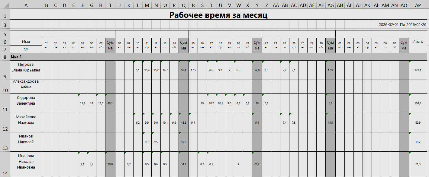 Производственная компания. Сотрудник Иванов числится в цехе №1, но по производственной необходимости неделю работает в цехе №3, а еще два дня — на складе. Система проходной (СКУД) исправно фиксирует все его перемещения, выгружая Excel-файлы с детализацией по часам.