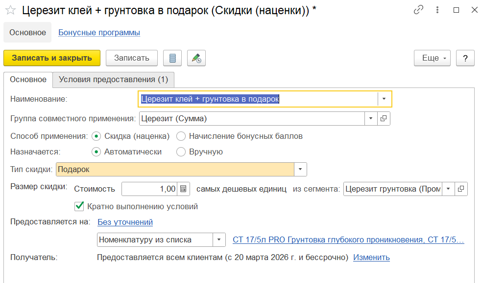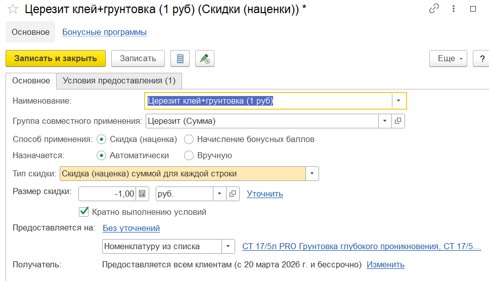 Кратность: Устанавливаем признак «Кратно выполнению условий». Это необходимо, чтобы скидка срабатывала за каждые 5 мешков клея (если клиент купит 10 мешков, получит 2 грунтовки).