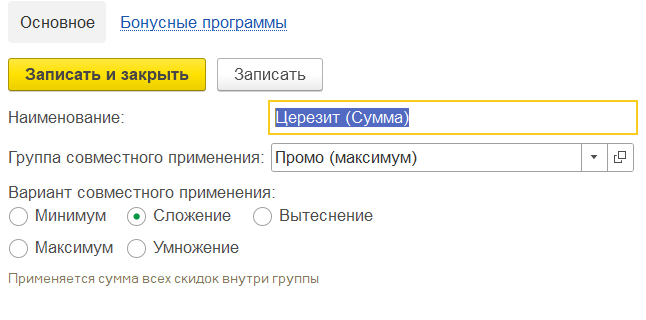 Чтобы система применяла две скидки одновременно включаем их в группу совместного применения с видом “Сложение”.