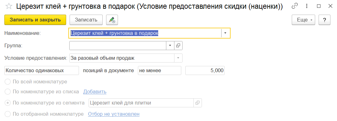 Сегмент «Церезит грунтовка» — включаем в него номенклатуру, которая будет выступать в роли подарка.